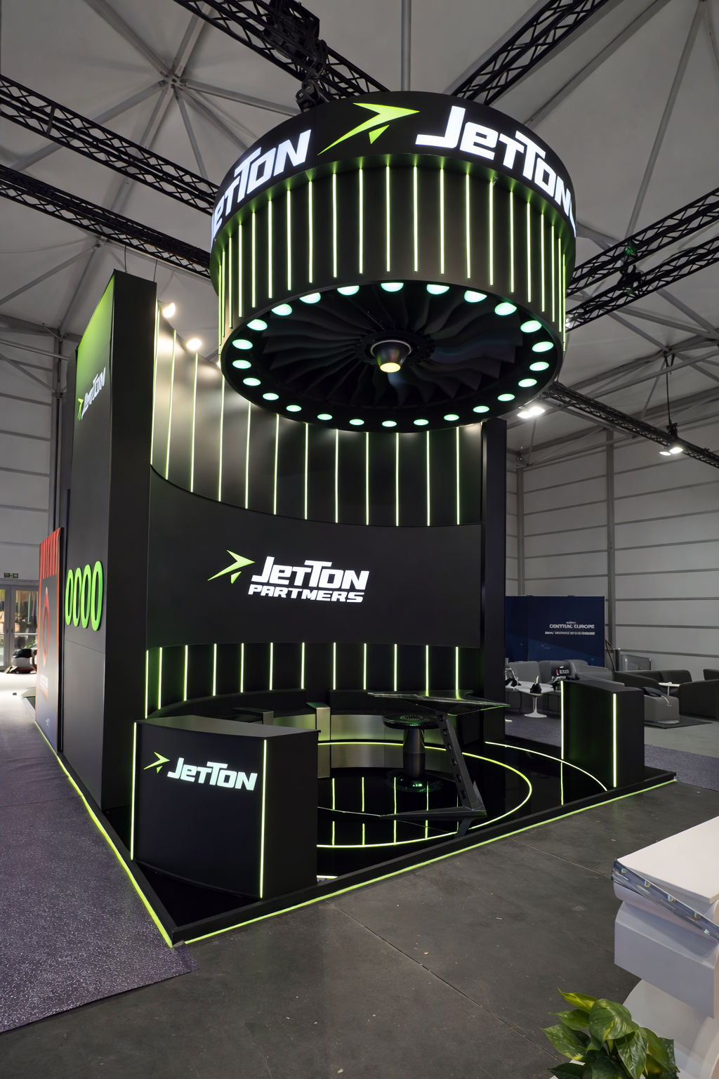 The JetTon stand was conceived as a high-tech exhibition space with a strong architectural and multimedia focus, designed to create a distinctive brand experience.